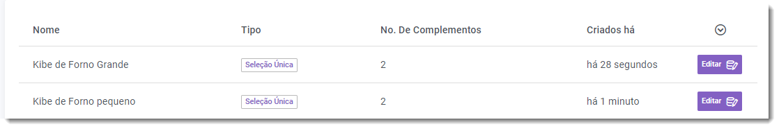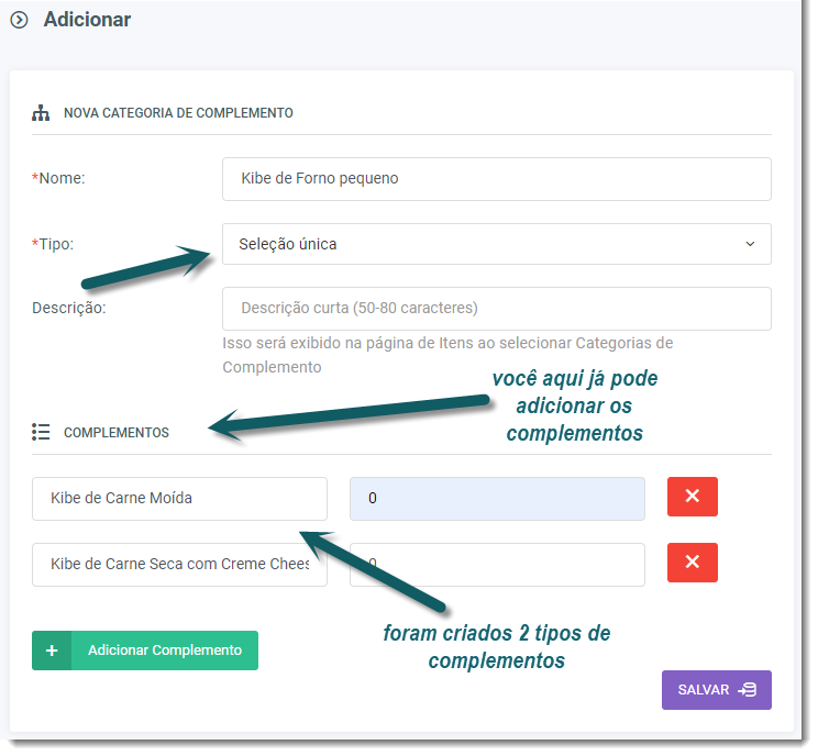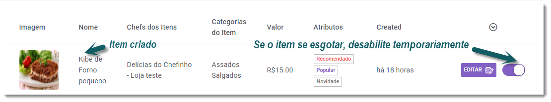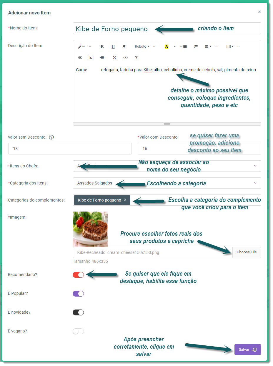 6 – Categorias de Complemento, o que é? Essa categoria é super importante, pois há diversos itens necessários para que o seu cliente finalize o pedido. Por exemplo, seu cliente pode escolher entre dois sabores do seu Kibe de forno, é nesta categoria que ele poderá fazer a opção. Nessa etapa você também poderá definir os tamanhos diferentes do seu produto. Vale lembrar que, nesse caso, provavelmente poderá ser adicionado um sabor mais caro que o outro, ou uma opção obrigatória, para isso, escolha Seleção Única, pode ser com valor ou sem valor, caso deseje oferecer diversas opções obrigatórias, escolha Seleção Múltipla, mas há casos em que você pode oferecer também ofertas e extras. 6.2 — Vamos criar a Categoria de Complemento :Kibe de forno Pequeno. Criando essa categoria, já podemos cadastrar 2 sabores como Complemento, exemplo: Kibe de carne moída e Kibe de carne seca com Cream Cheese, em seleção única (ou seja, um sabor ou outro). Como será seleção de sabor, não precisamos colocar o valor, nesse caso, preenchemos com “0”. Veja na figura abaixo. 6.3 – Categorias e complementos cadastrados 7 – Adicionando os Itens. Dicas importantes: confira frequentemente a disponibilidade dos itens anunciados, assim que zerar e vender o último item do anúncio, desative o item imediatamente no seu gestor. Não deixe seus clientes desapontados com pedido pendente eternamente para ser entregue, caso ocorra algum imprevisto, entre em contato com o TapChef para cancelarmos o pedido e não gerar avaliação negativa ao seu negócio. 7.3 – O Item, após ser criado, é possível editá-lo e desabilitá-lo temporariamente, caso tenha se esgotado. Se quiser, é possível desativá-lo definitivamente. 7.4 – Os itens cadastrados ficarão assim no anúncio para o cliente no Aplicativo TapChef: 8- Nada como o próprio Chef para conhecer a melhor forma de anunciar os seus produtos. As dicas acima para criação do seu Manu irão lhe ajudar, porém, sempre que necessitar e tirar dúvidas, entre em contato com nosso suporte. Nossos canais de contato: cadastro@tapchef.com.br WhatsApp: 21 98287-5438 DICAS 1 - Quer obter fotos para incrementar seu negócio ? clique aqui 2 - Quer aprender a editar suas fotos com toques profissionais? use o Krita (Editor de fotos Profissional gratuito)